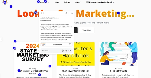 Interactive page overlay with accessibility issues manually marked and annotated. No need to sign up or download anything.